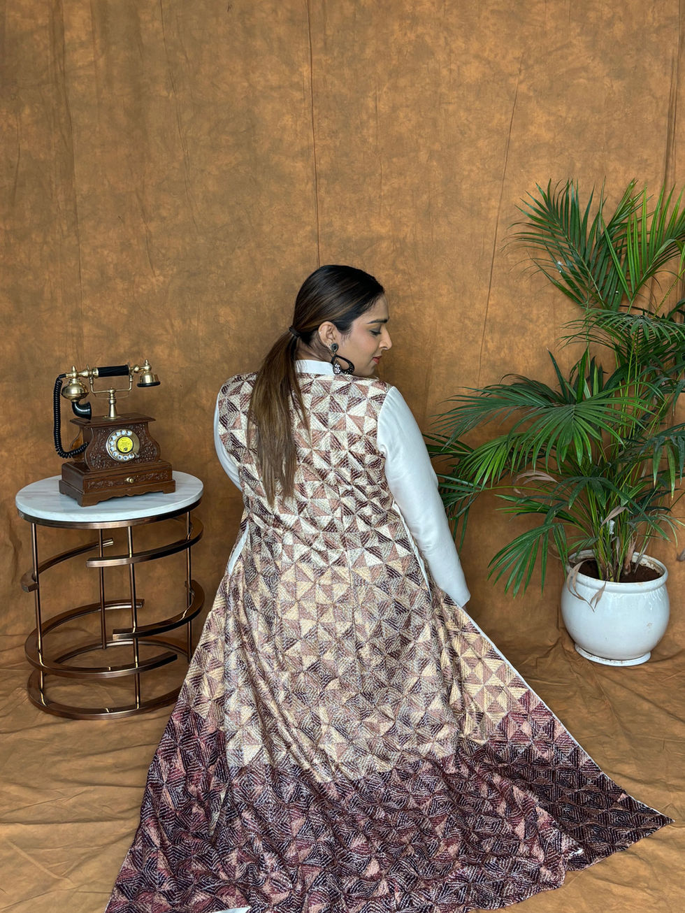 Details: Parantha work phulkari in shades of golden, beige and brown. Plain white sleeves with fusing and shoulder padding.